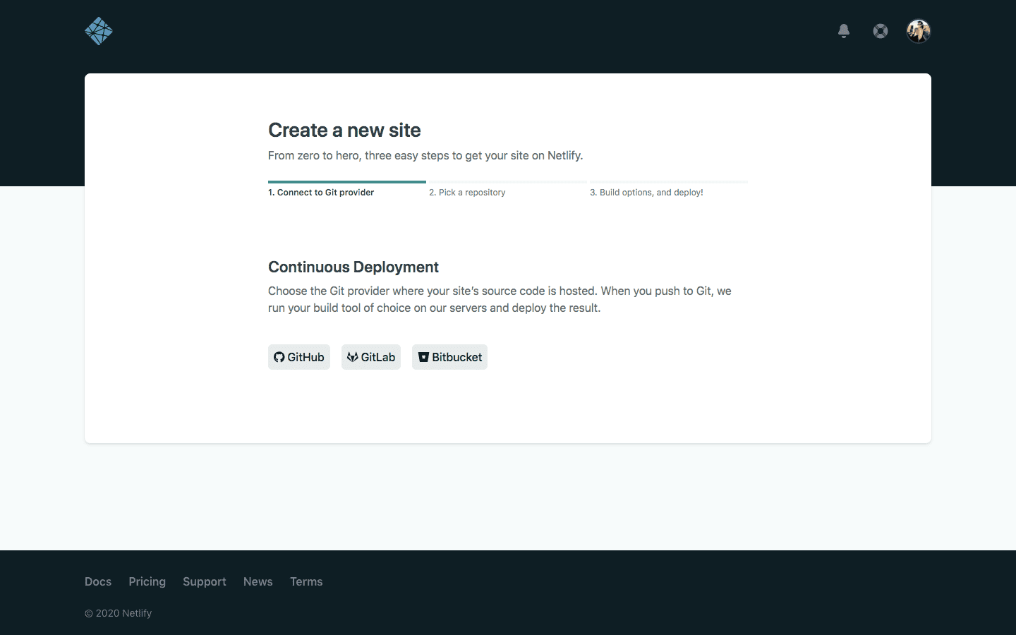 After clicking on that, you’ll be taken to a new screen where you connect your netlify account to whichever Git host you use. I use GitHub, so that’s what I click on. However, if you use GitLab or BitBucket, then click on those.