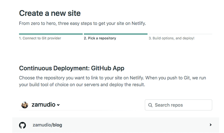 After connecting to your Git host, you want to choose the repository that contains the project you want to deploy, like so: