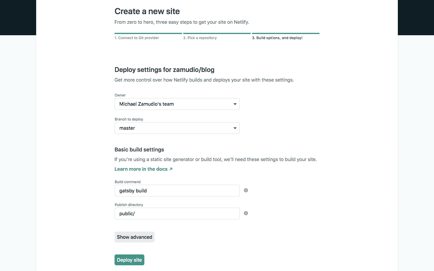 Finally, you end up on the last page where you want to make sure the branch you’re deploying is master and then you hit the button at the bottom that says Deploy site