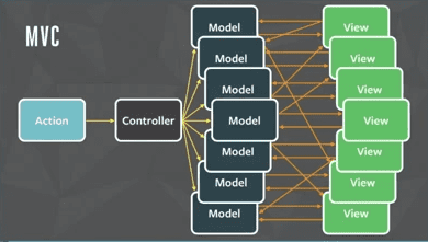 This was a real problem for Facebook. Imagine your app having billions of people connected to it, all viewing things at the same time, making updates at the same time, etc. In MVC this creates the chaos you see below.