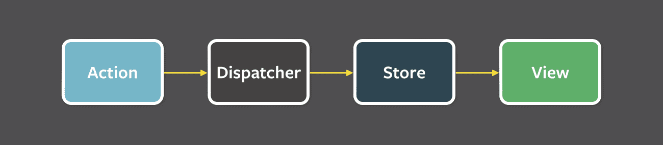 Using the above image as a visual guide, when a user does something, the view creates an action. This action then creates new data and sends it to the dispatcher. The dispatcher then shares the action result with the store. The store updates the state and the view, which is listening to the store for updates, then updates itself to represent to most recent view state.